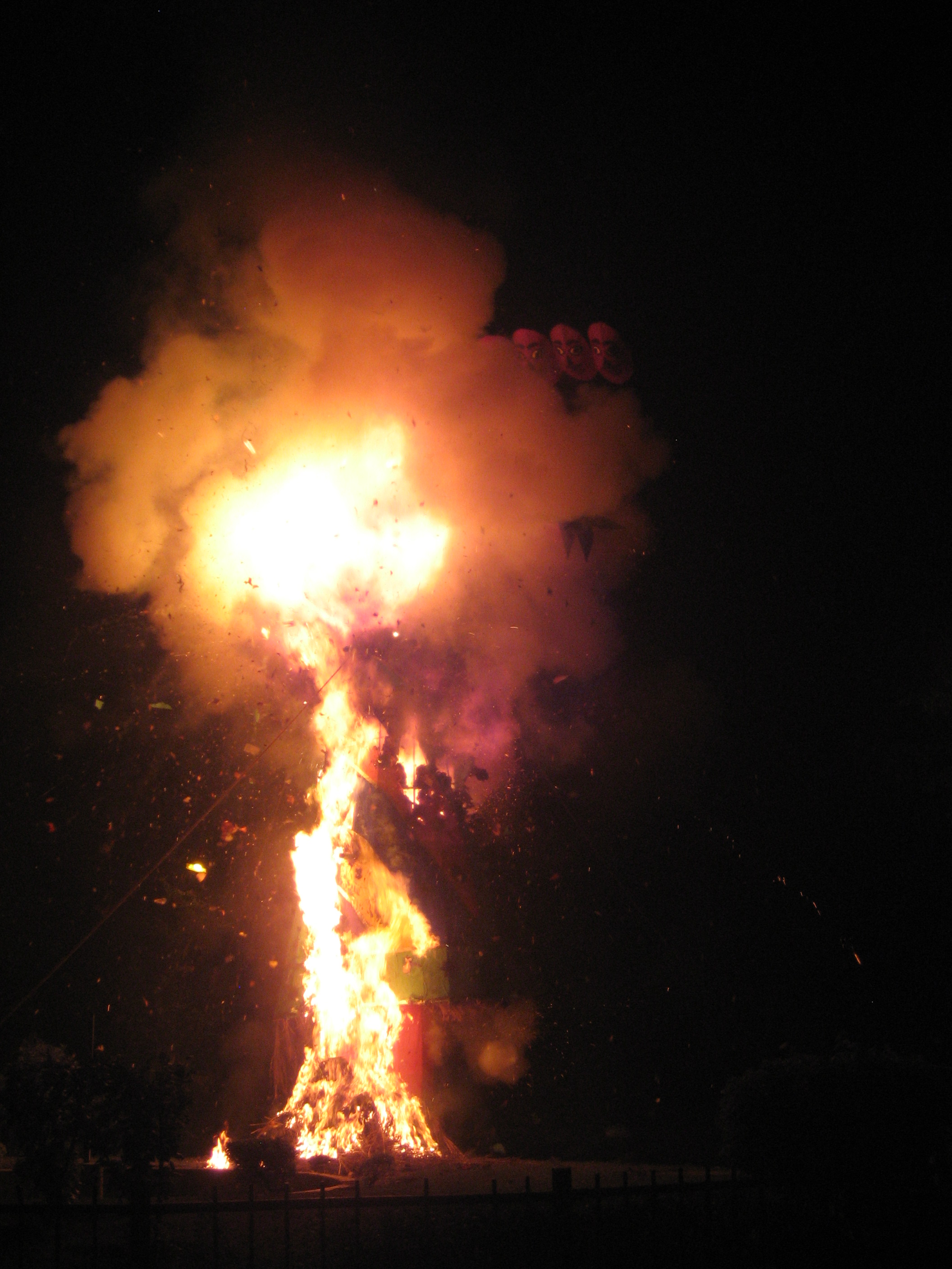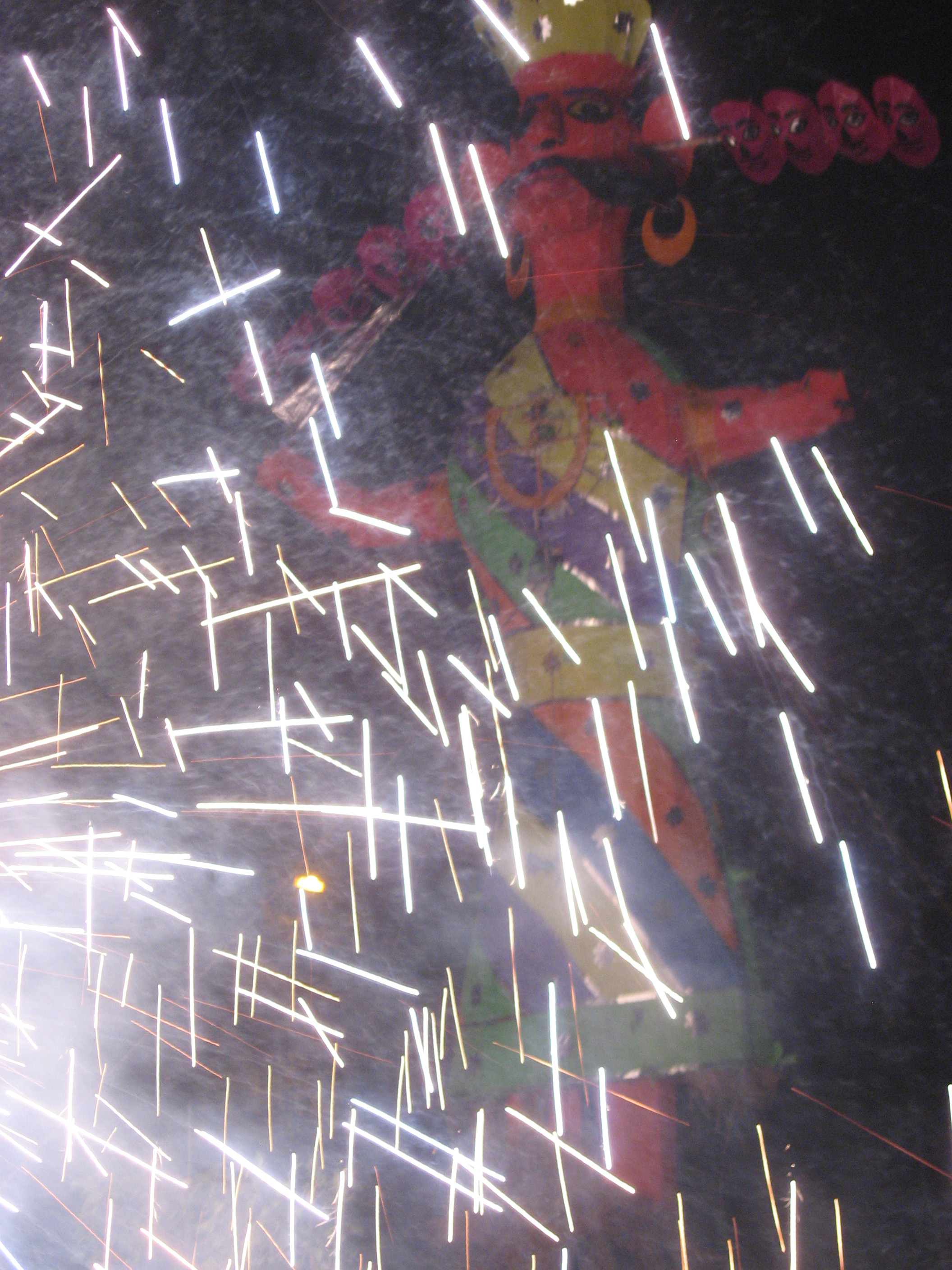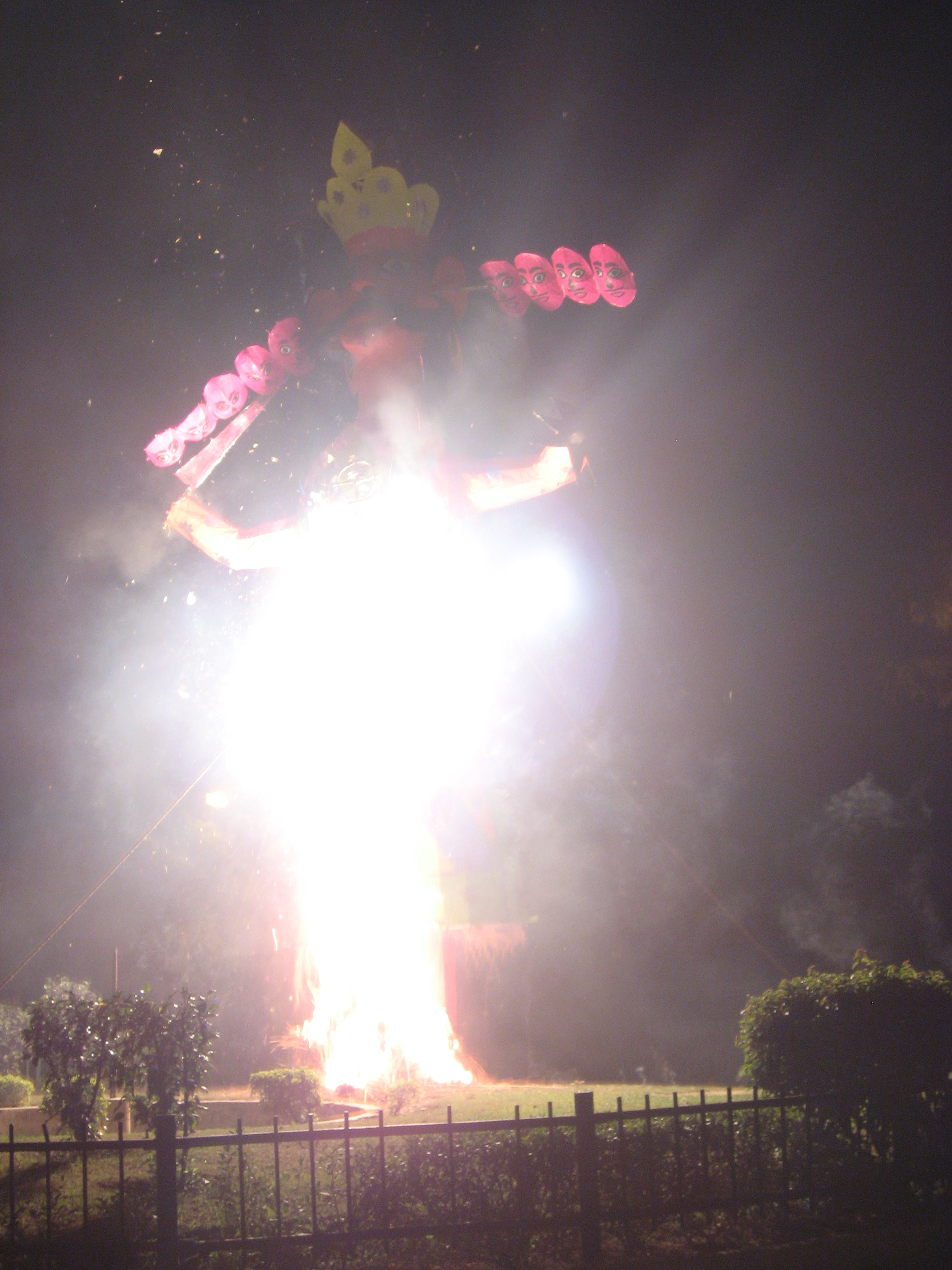 Tonight, there have been fireworks displays, ending with a ceremonial burning of effigies celebrating Ravana’s defeat by King Rama. Ravana was a rival king, who had abducted Rama’s wife Sita to what is now Sri Lanka – signifying, as I explained in a post last Dussehra, victory over hubris and ego.