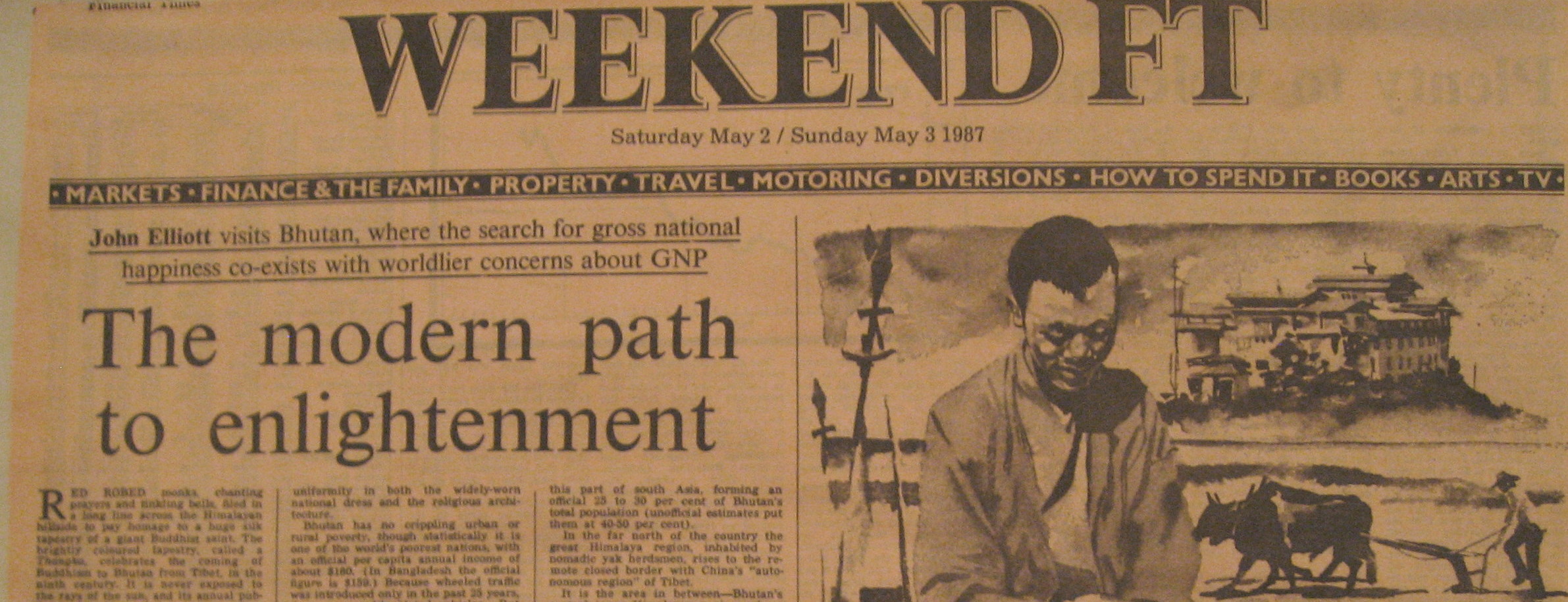 A couple of years ago I was contacted by an American journalist who thought that an article I wrote in the Financial Times in 1987 was the first to record the Himalayan kingdom of Bhutan’s search for “Gross National Happiness”. Some sources suggest the phrase was coined in 1972, but my report (above) of an interview with the then 32-year old King Jigme Singye Wangchuck certainly happened around the time that he was developing his utopian idea.