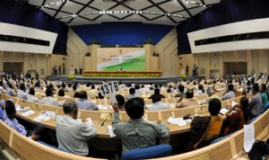 That is the man who last Monday sat bizarrely alone on a huge stage at the government’s Vigyan Bhawan main conference hall (below), facing several hundred journalists in tiers of seats so remote that it was impossible to generate the mood of a participative press conference. Very few ministers turned up to support him, though he brought some top advisers from his office.