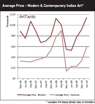 In a bullish analysis of the three auctions published today ArtTactic , a London-based analysis firm, says that average auction prices (left) and volumes for modern Indian art “are now back to levels seen at the peak in June 2008”.