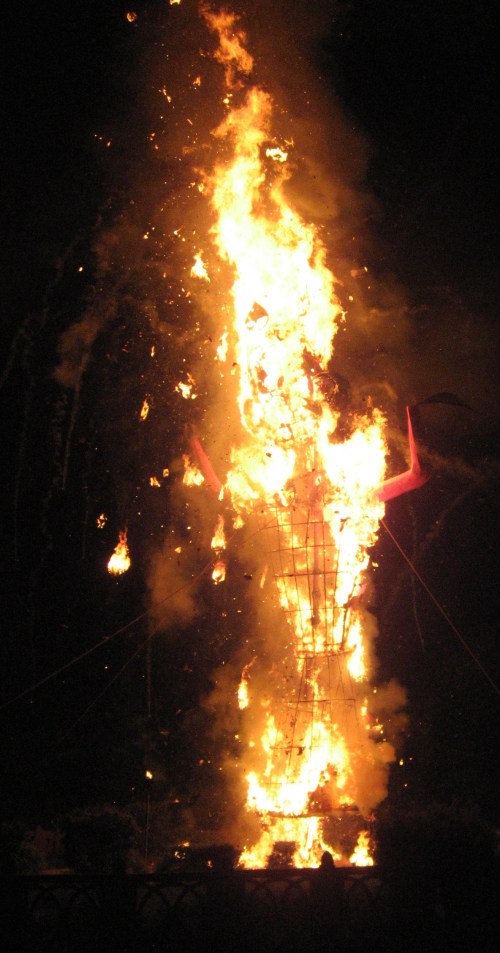 It’s the festival of Dussehra and I’ve just been to watch a huge effigy of Ravana going up in flames in Golf Links where I live in central Delhi – here are some pictures.