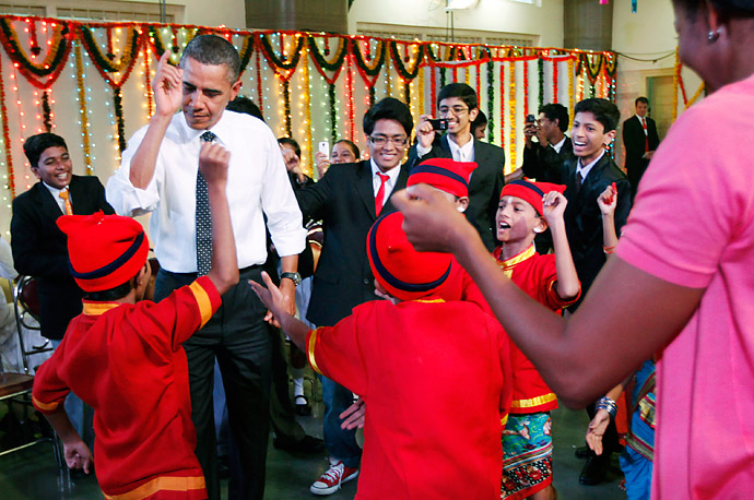A little earlier he had danced (above – AP photo) with young children during the Diwali festival – emulating Michelle Obama who enchanted schoolchildren yesterday. He also talked on a video-link up with villagers in Rajasthan about how e-conferencing can help them develop and sell their crops.