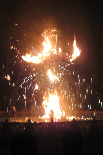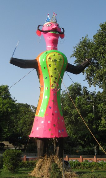 Displays of fireworks all over the country have this evening ended with ceremonial burnings of Ravana effigies, often in a trio with his son Meghnad and brother Kumbhakaran. I’ve just seen Ravana go up in flames in Golf Links, where I live in localDelhi– see the pictures here.