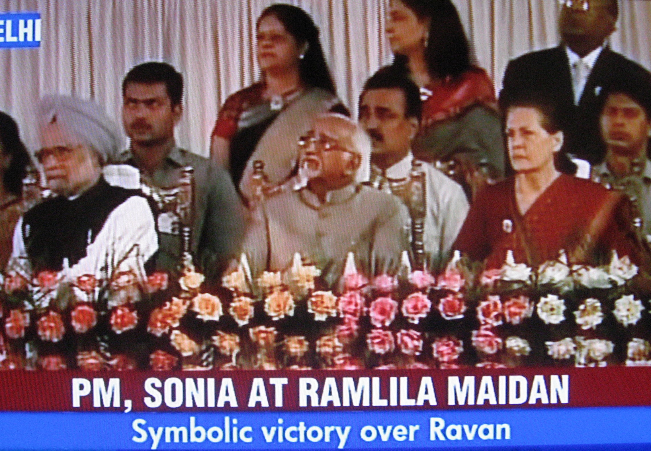 There’s been a nice irony in New Delhi tonight where top politicians led by prime minister Manmohan Singh, and Sonia Gandhi, the governing coalition’s leader, went to the old city’s Ramlila grounds to celebrate today’s Dussehra Festival (picture below on Headlines Today tv).