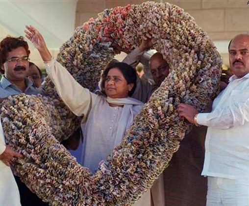 She was 56 on Sunday and had a relatively low-profile birthday. That contrasted with earlier extravagant parties, when Lucknow has been decorated with thousands of lights and Mayawati has worn expensive diamond and gold jewellery, with garlands of big-valuation currency notes, reported to be worth Rs18 lakhs -$40,000 (right – in 2010), and multi-tiered cakes weighing over 50kg.