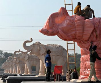 One can see Qureshi’s logic because Mayawati (left, with statues in 2009) is the chief minister candidate in the elections and the elephant is her party’s symbol. (The fact that this maverick and autocratic politician, who brooks no opposition, obeyed him is a testament to the uniquely independent authority that the Election Commission wields in this unruly country).