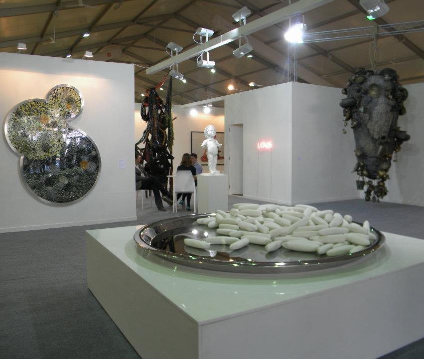 On the Gallery Espace stand, G.R.Irani had an installation (left) of wooden slippers and a red car roof light like those used by Indian politicians and officials) priced at Rs600,000 ($12,000). He told me it signified “a protest against violence and how we are losing our morals and values, with the flashing light creating tension”.