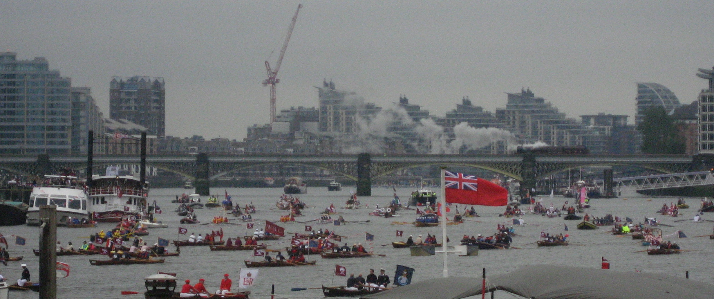 Upstream from Chelsea, with a ceremonial vintage steam engine crossing a railway bridge to mark a stage in the pageant