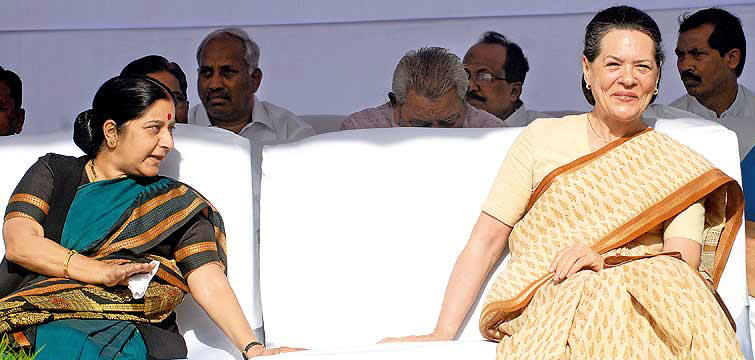 “PM that never was; the Oppn that shouldn’t be” pic and caption – of BJP leader Sushma Swaraj and Sonia Gandhi – in Outlook magazine where a revised version of this article appears as a column (see comments below)