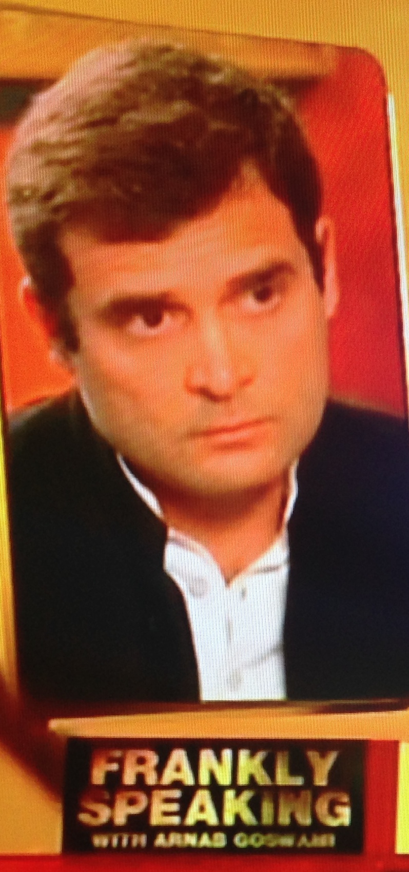 His choice of tv station for his first such interview was curious because, instead of going for what might have been a gentler and more amenable and constructive interview on a channel such as NDTV, he chose TimesNow and its abrasive chief editor, Arnab Goswami (above), who is famous for his high-decibel confrontational chat shows. Goswami was quiet and relatively courteous, indeed sometimes almost mockingly obsequiously so, but he was much more interested in trying to trap Gandhi into potential headline gaffes than exploring detailed policies. I suspect that Rahul’s sister Priyanka was in the room for the interview, judging by his body language (he repeatedly glanced off-camera, as if for support, and once indicated to the side when he mentioned her). And it looked (from shots when he arrived and the Husain pictures on the walls) that it was done at Rajiv Gandhi Bhavan, headquarters of the Rajiv Gandhi Foundation where Priyanka has a leading role.