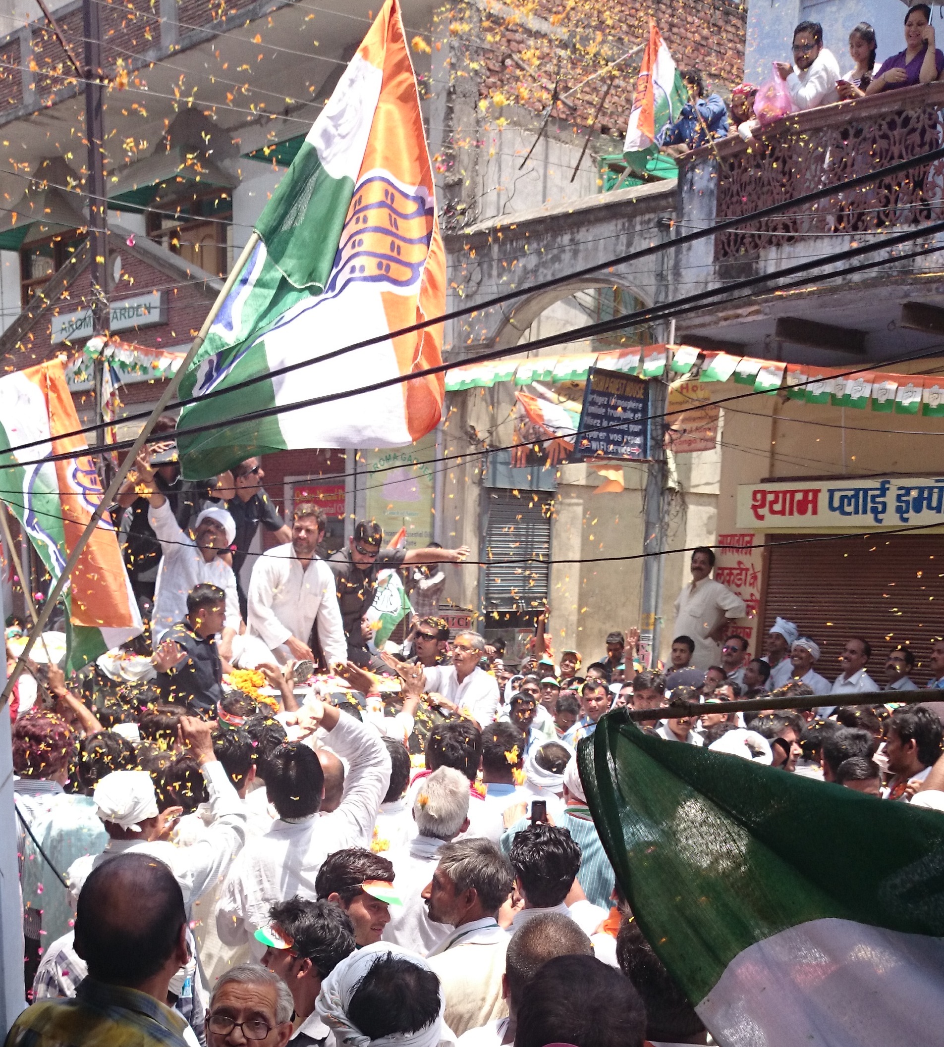 Earlier in the day I watched Rahul Gandhi being cheered and mobbed by huge crowds of supporters when he drove through the streets. His road show was suddenly arranged as a response to Modi breaking with convention and campaigning in Gandhi’s constituency of Amethi. Usually party leaders do not stage rallies on their rivals’ home turf, but Modi is out to break conventions.