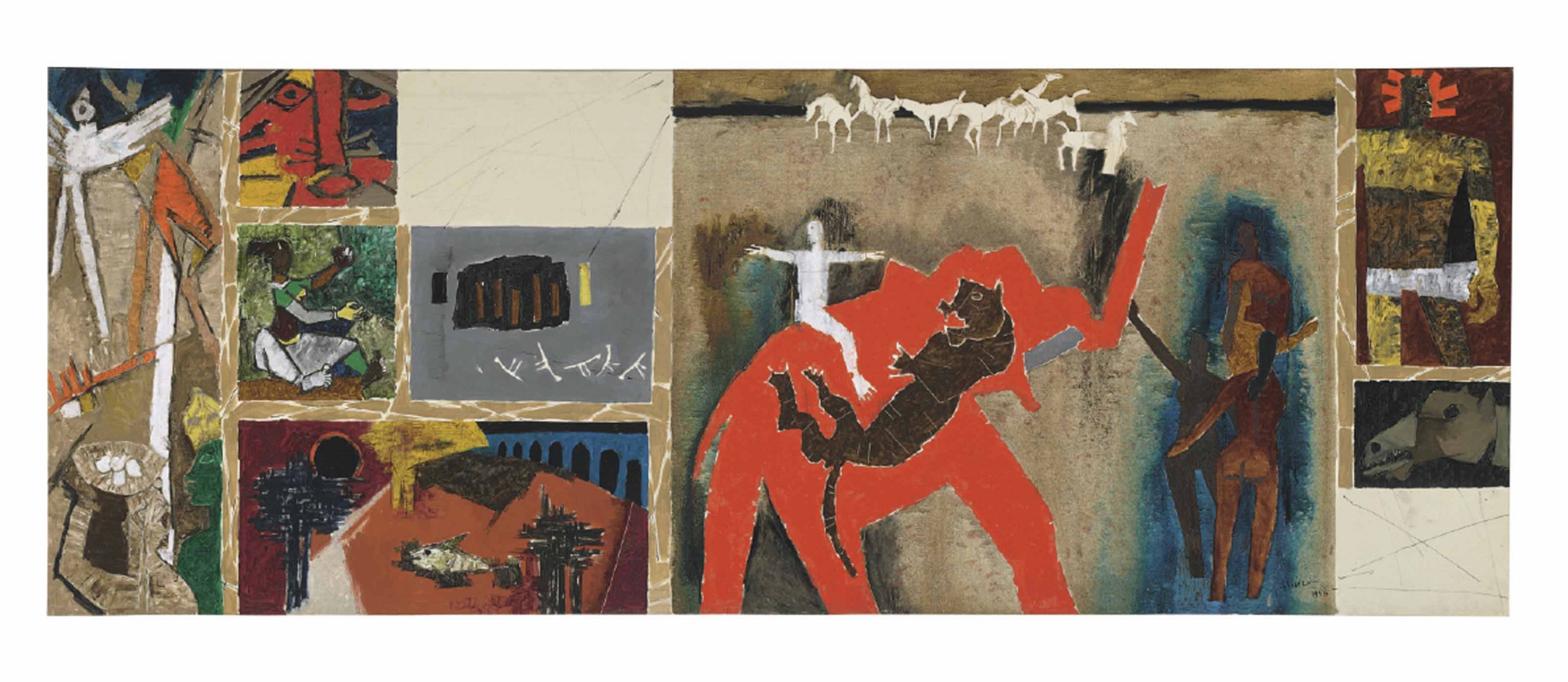Originally shown in 1956 at the Venice Biennale, the work is more than 8ft wide. Ten panels depict ideas and subjects such as a village woman, a triumphal elephant and galloping stallions that became Husain’s trademarks in later years, representing says Christie’s “a political testament to a progressive India”.