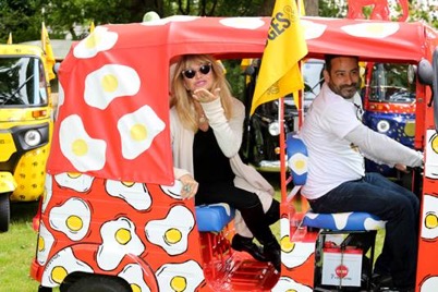 The auction auto-rickshaws, built to the same engineering specifications as those in India with 198cc petrol engines, have been roaming the streets of London for the past month with a top speed of 35mph. They were launched by actress Goldie Hawn (below with the friend egg paintwork).