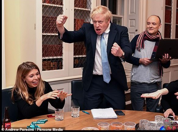 He provided virtually every British newspaper with a front page picture (above) of him leaving, carrying a cardboard box of his belongings – including, some reports suggested, Johnson’s and other secrets that he could leak. Cummings knew there would be photographers waiting on the pavement opposite, and he was later pictured going to his London home carrying a bottle of champagne in a plastic bag.