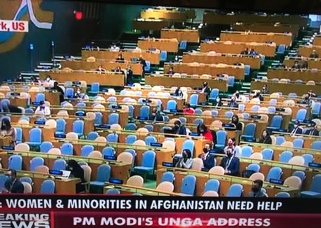 His response was robust when he spoke at what looked (on television – pic below – and noted on Twitter) like a rather sparsely attended meeting of the UN general assembly in New York.
