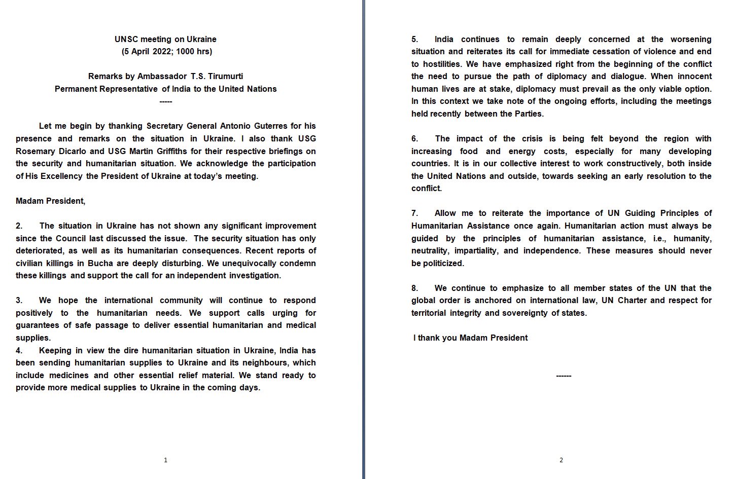 “Recent reports of civilian killings in Bucha are deeply disturbing,” T.S. Tirumurti, India’s permanent representative to the UN, told the Security Council where it currently has a seat as a non-permanent member. “We unequivocally condemn these killings and support the call for an independent investigation”.