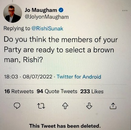 One notoriously controversial lawyer tweeted about whether the Conservatives would want a “brown man” as leader. That led to an uproar and the tweet was deleted, but it did lead to the thought that the traditionalist largely middle-class elderly voting members of the Conservative Party might be less willing than the general electorate to see Sunak in Downing Street.