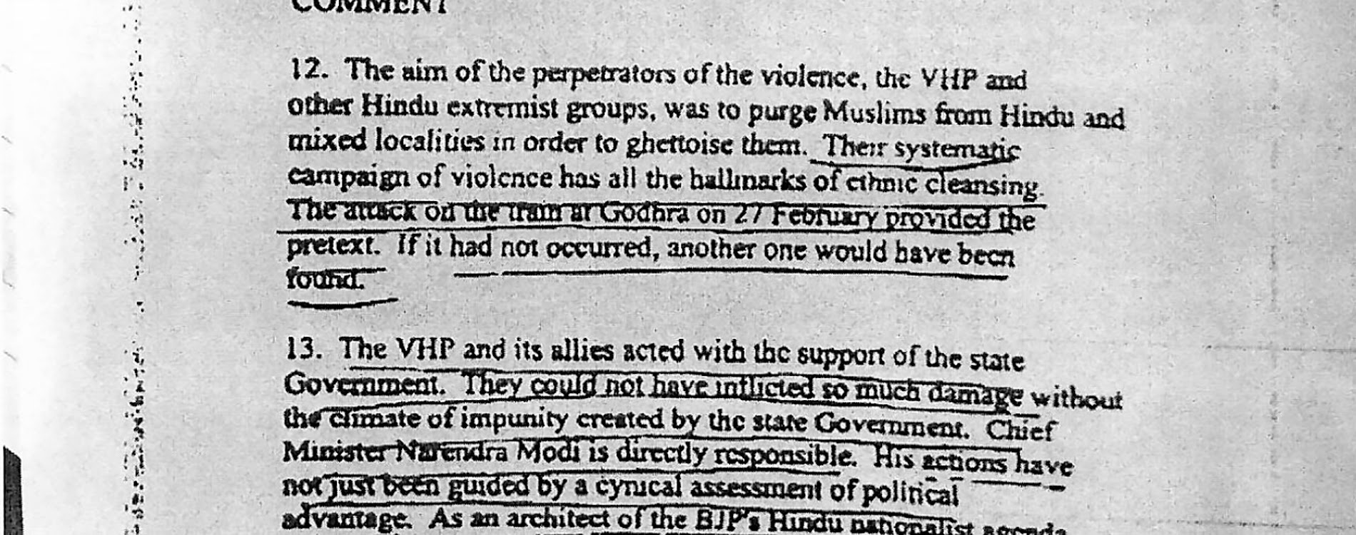The only new item in the series was an unpublished secret 2002 report by the British High Commission (embassy) in Delhi for the Foreign Office in London. This found Modi “directly responsible” for what it described as a “systematic campaign of violence” by Hindus against Muslims “that has all the hallmarks of ethnic cleansing” (.