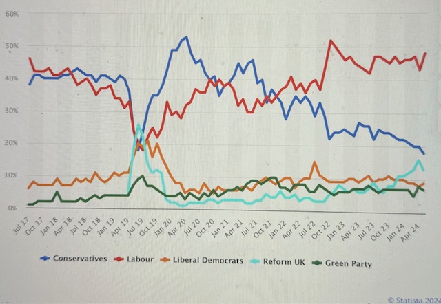 Popularity opinion polls show the Conservatives have been dropping sharply and are now down to 23%, way below Labour at 45%. Ominously for Sunak, the right-wing Reform Party (previously the Brexit Party) is on 11% with the Liberal-Democrats at 9%. Reform’s candidates will eat into the Conservative vote, strengthening Labour’s likely majority.