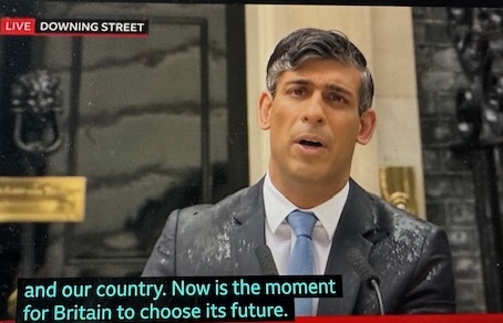 Sunak stood in pouring rain yesterday evening in Downing Street to announce that he was calling the election. His speech was heavily focussed on the economy and security at “this most uncertain of times”. The visual image was spoiled by Sunak being drenched in the rain and the audio by sounds of the Labour Party-favoured song “Things Can Only Get Better” being boomed out at the end of the street.
