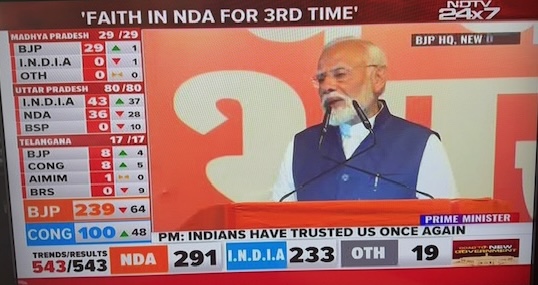 Modi put as brave a face as he could on the losses and is presenting the result as a victory for Indian democracy and a success for the BJP winning a rare third consecutive term with a sizeable majority over the I.N.D.I.A. Speaking alongside grim-faced fellow BJP leaders at a party rally when the results were clear, he said the government would now write a “new chapter of big decisions”.