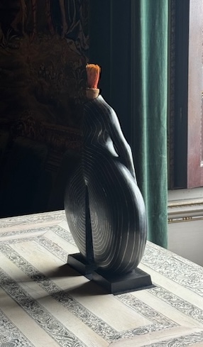 Mostly small delicately shaped works blend in the Houghhton mansion’s grand 18th century rooms with the original décor and ornaments. Indian connections include three “dark torsos” in black basalt. There are also a Bidri Jug and Bottle with a black patinated and copper casing inlaid with sterling silver, the bottle standing on the desk of Warren Hastings, the first Governor-General (right). Cox produced them using Karnataka’s traditional bidri metal handicraft in collaboration with the KASH Foundation in Bangalore, which links artists with traditional craftsmen.