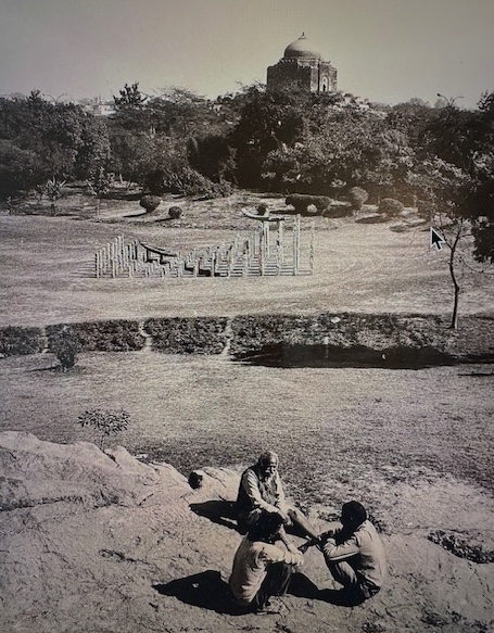 His affection for the Tamil Nadu coastal people and traditions is demonstrated by Yatra (above), also called Granite Catamarans on a Granite Wave. First done in the mid-1990s at the Jamali Kamali Gardens near Delhi’s Qutub Munar (left) and now on show at Houghton, fishing boats are balanced on poles in black and white Indian granite.