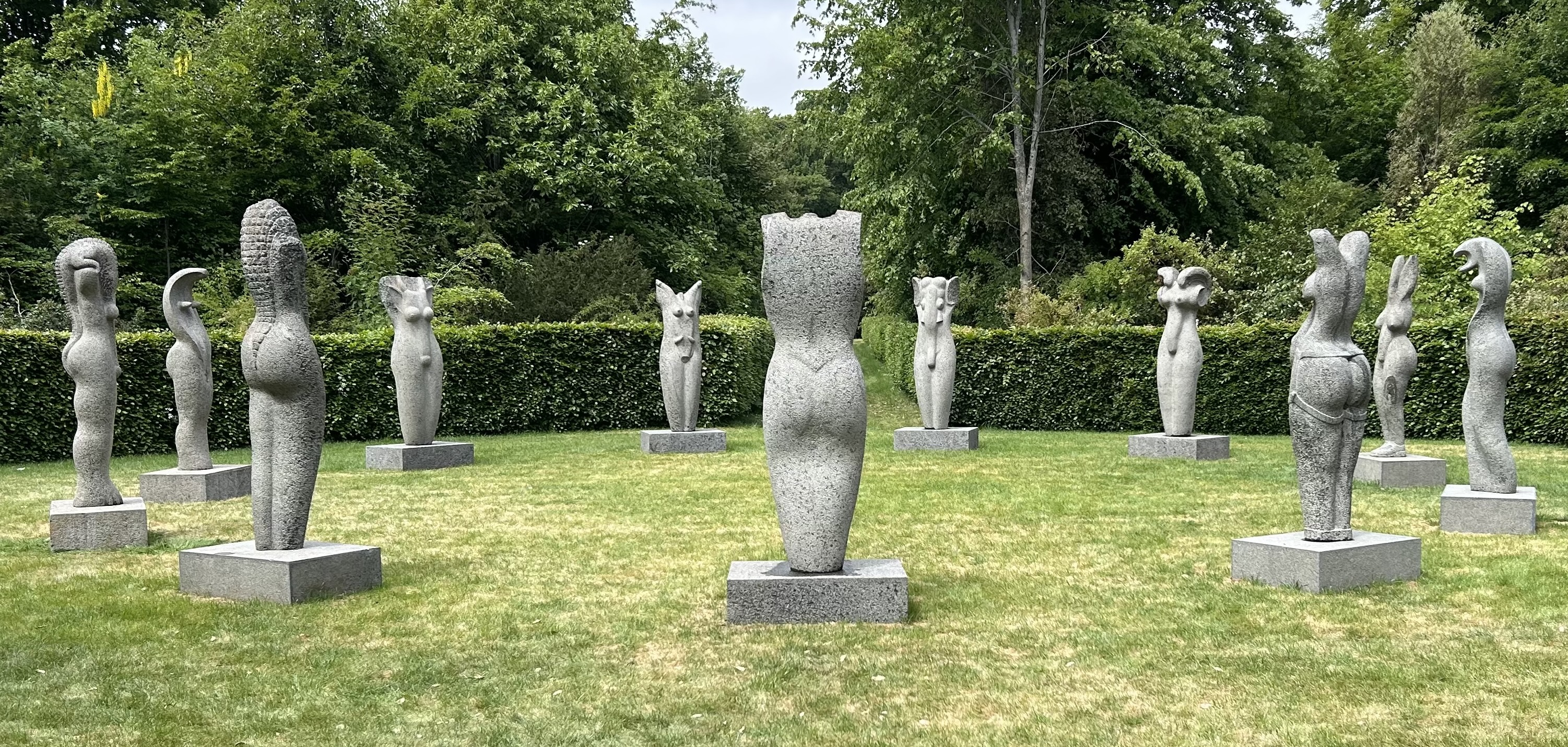 Outside, located on spacious lawns and hidden in woods, are 20 mostly large abstracts and statues with stone from Egypt as well as India along with other sculptures that are permanently there.