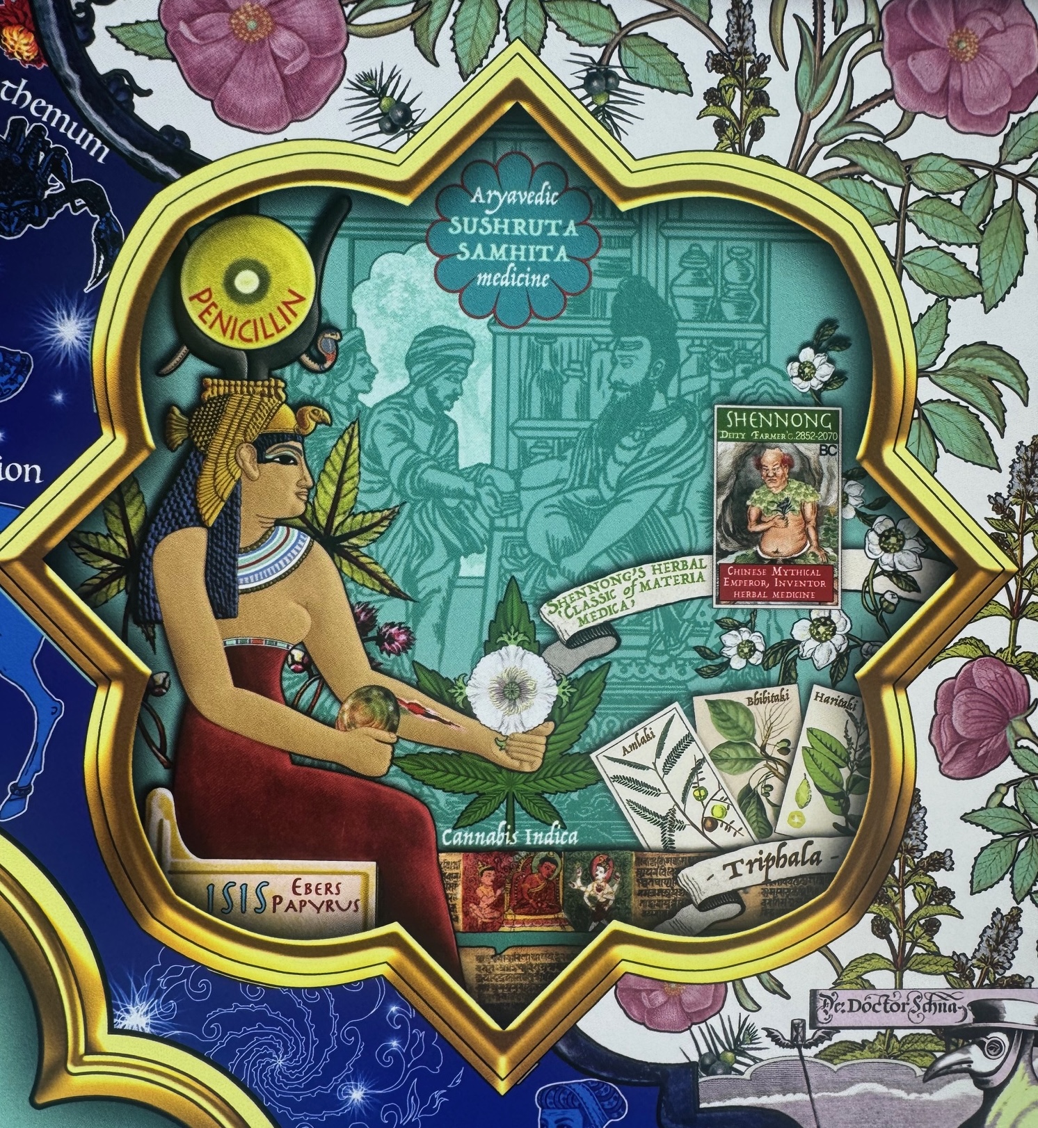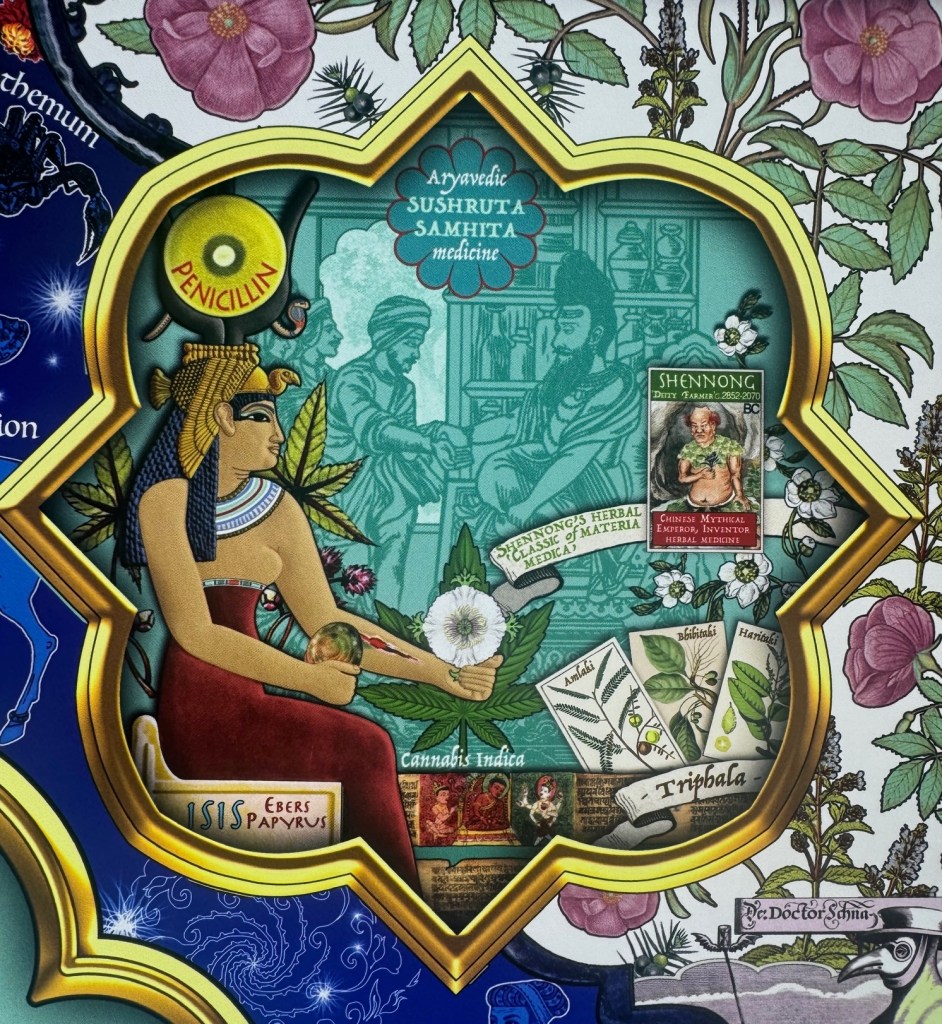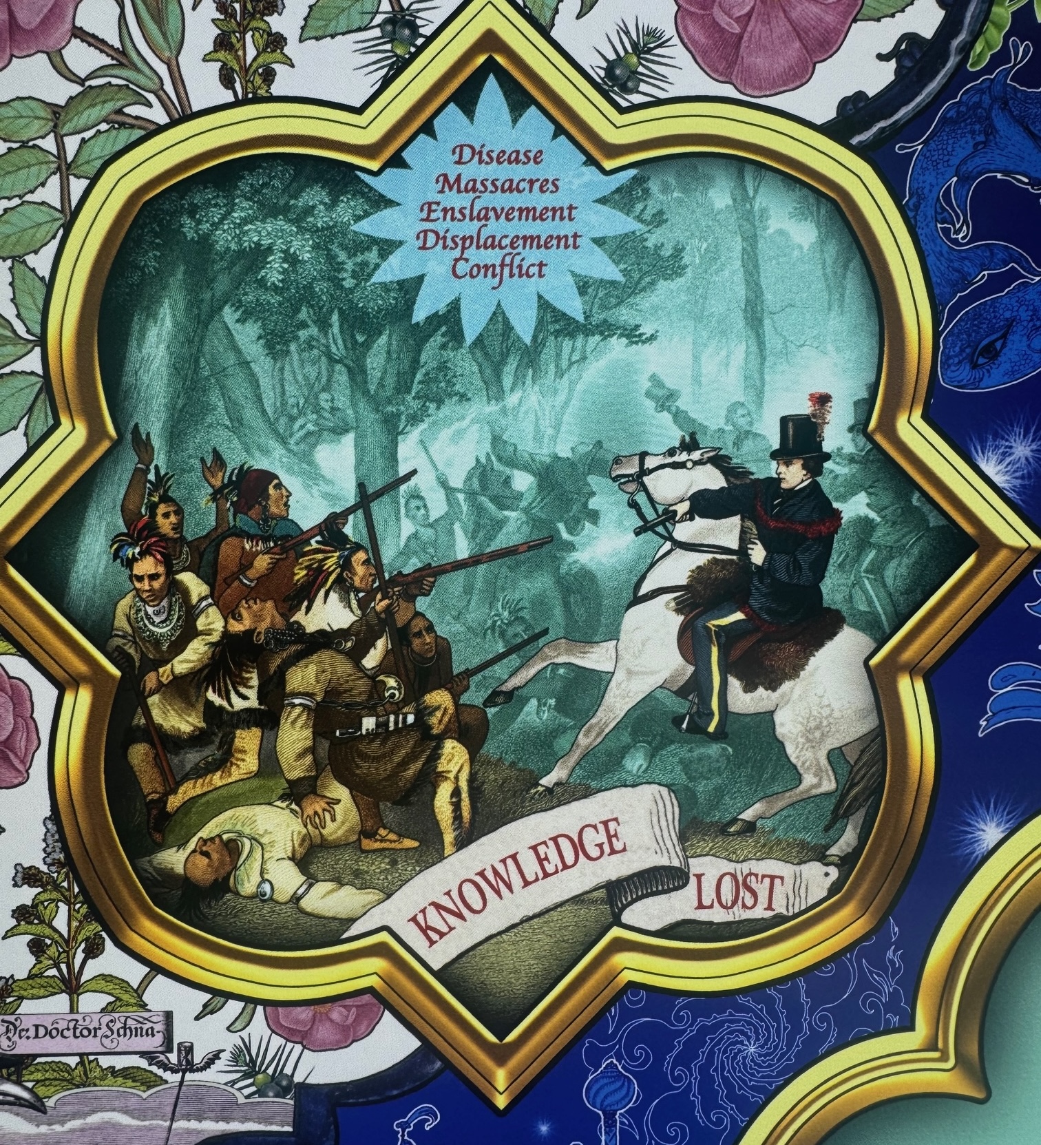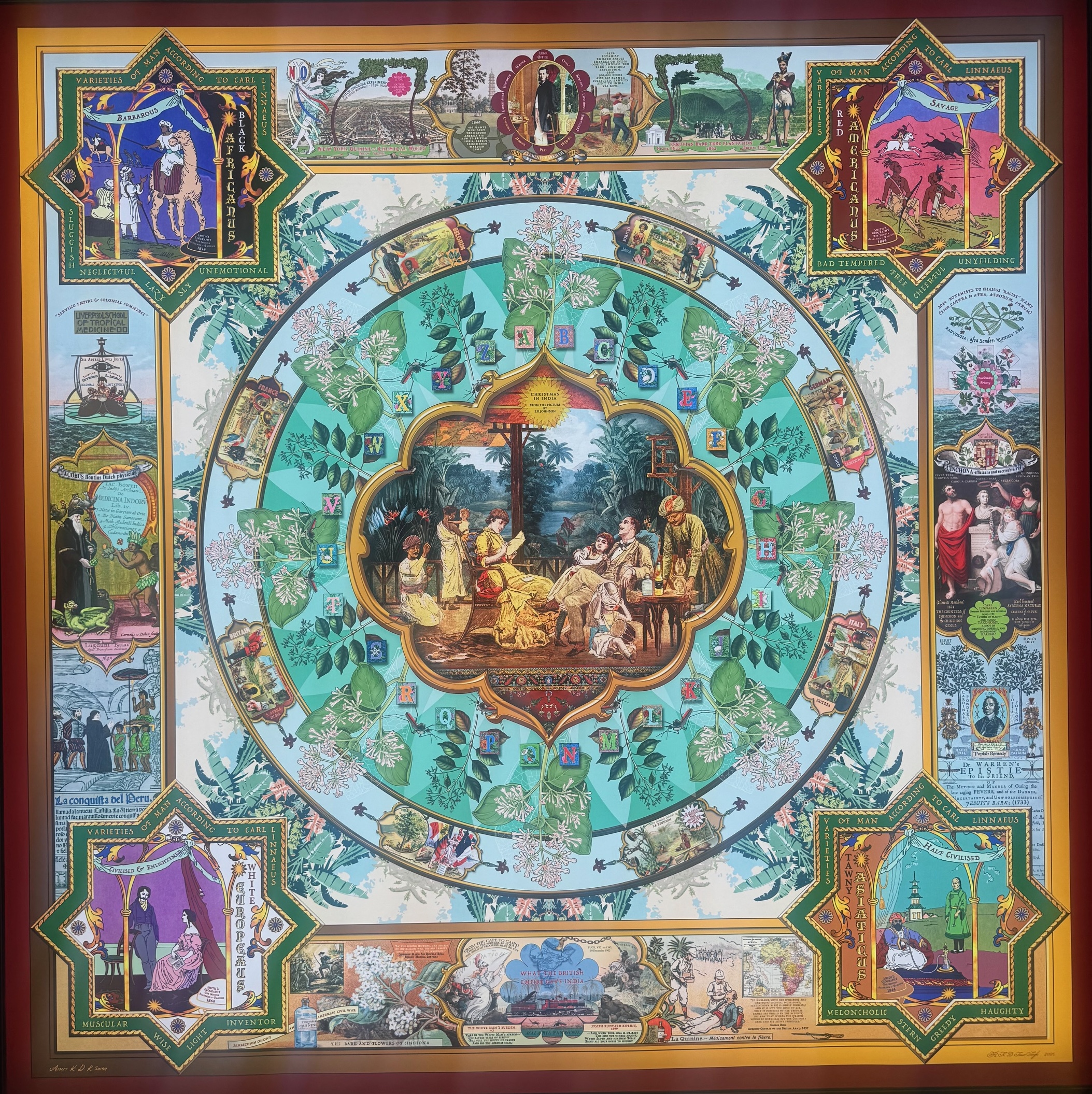 The exhibition includes a work, Cinchona: What’s in a Name marking how in 1860 a British expedition to South America smuggled out cinchona seeds and plants that led to the development of quinine to treat malaria. Planted extensively in British India and Sri Lanka those stolen seeds and plants saved millions of lives, until an artificial synthesis of quinine was developed in 1944, but the Twins introduce it negatively saying it was “significant in the colonisation of tropical countries”.