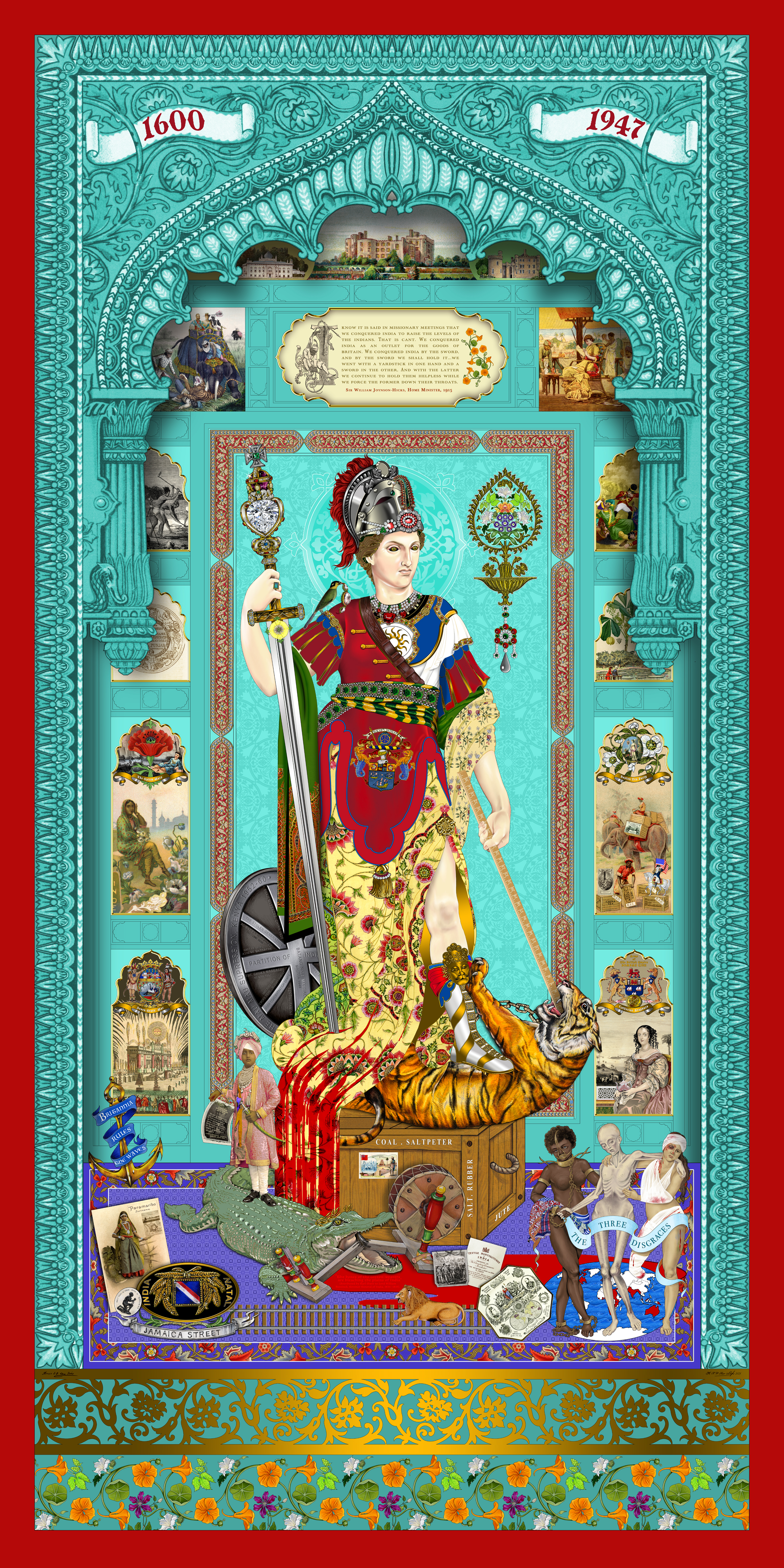 The main figure is a female warrior representing Western Imperialism standing above a tiger, piercing it in the mouth. Smaller images surrounding the figure illustrate the exploitation with a quotation saying, “India was ruthlessly conquered as an outlet for British goods”, which actively contributed to the “destruction of India’s industries”.
