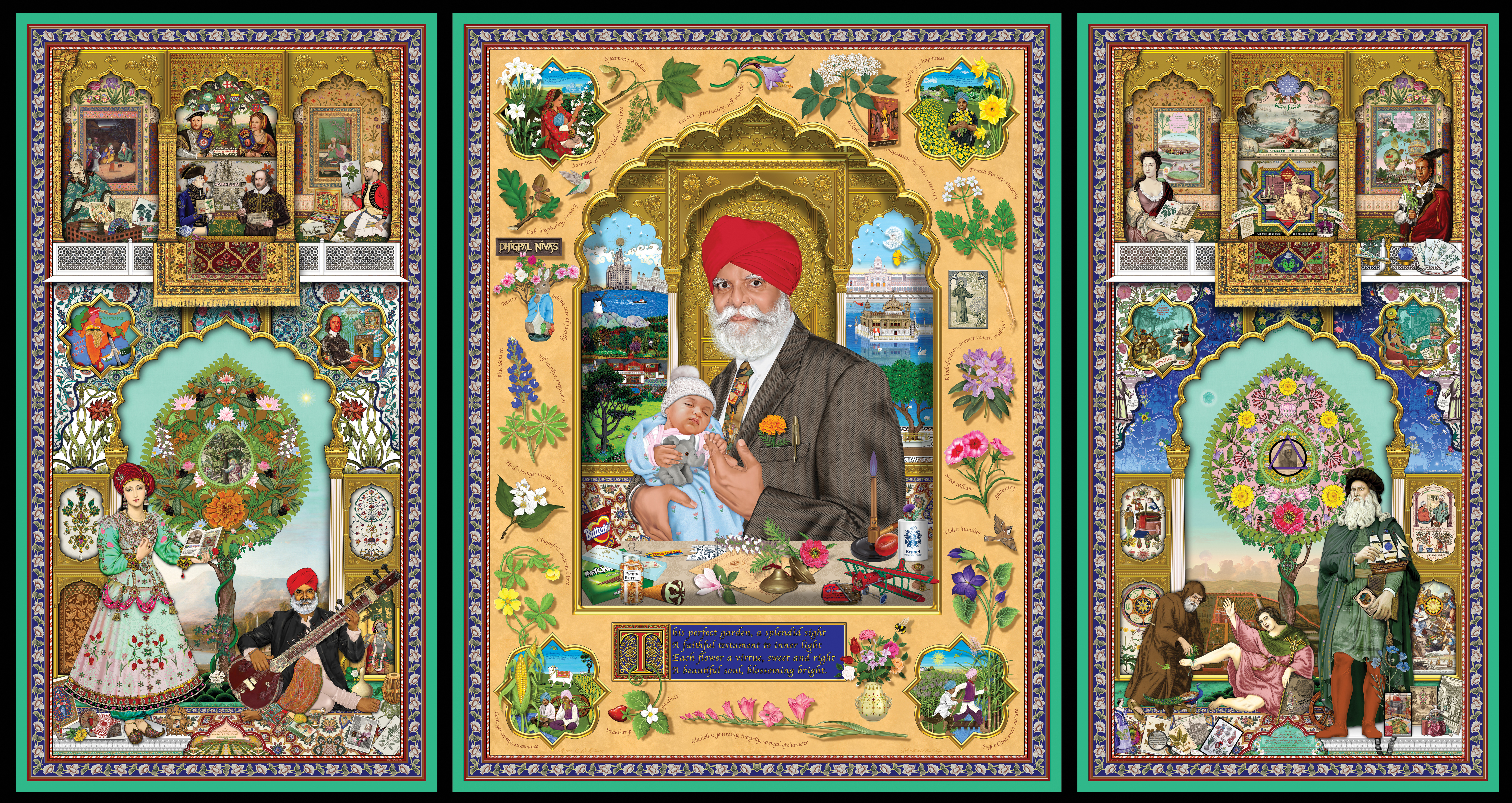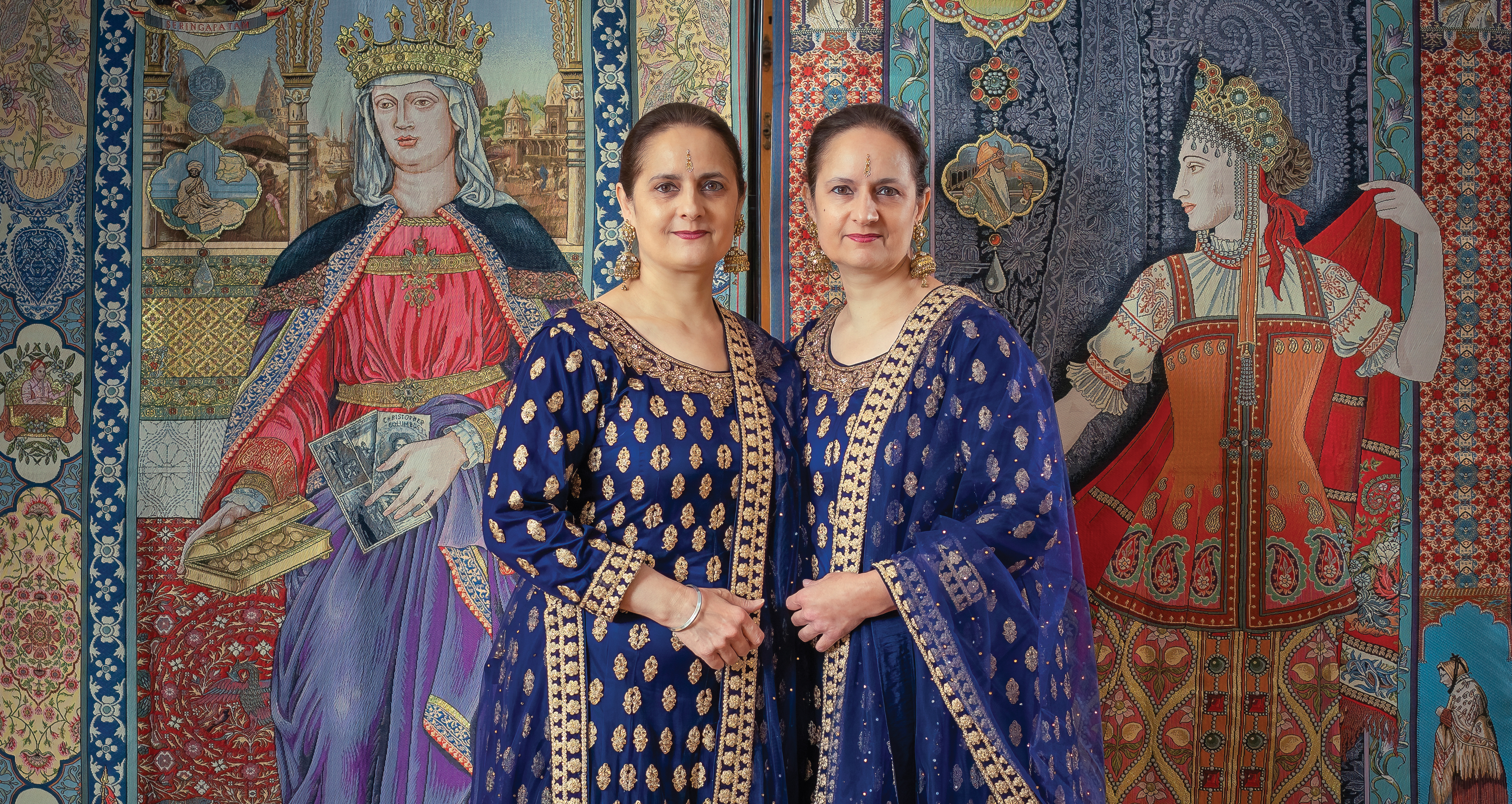 Born in the UK with a Sikh father who emigrated from India in 1947, Amrit Kaur Singh and Rabindra Kaur Singh are identical twins in their late 50s. They always dress alike and talk together, interrupting and finishing each other’s sentences. Their father, and their Sikh background, flow through many of the works.