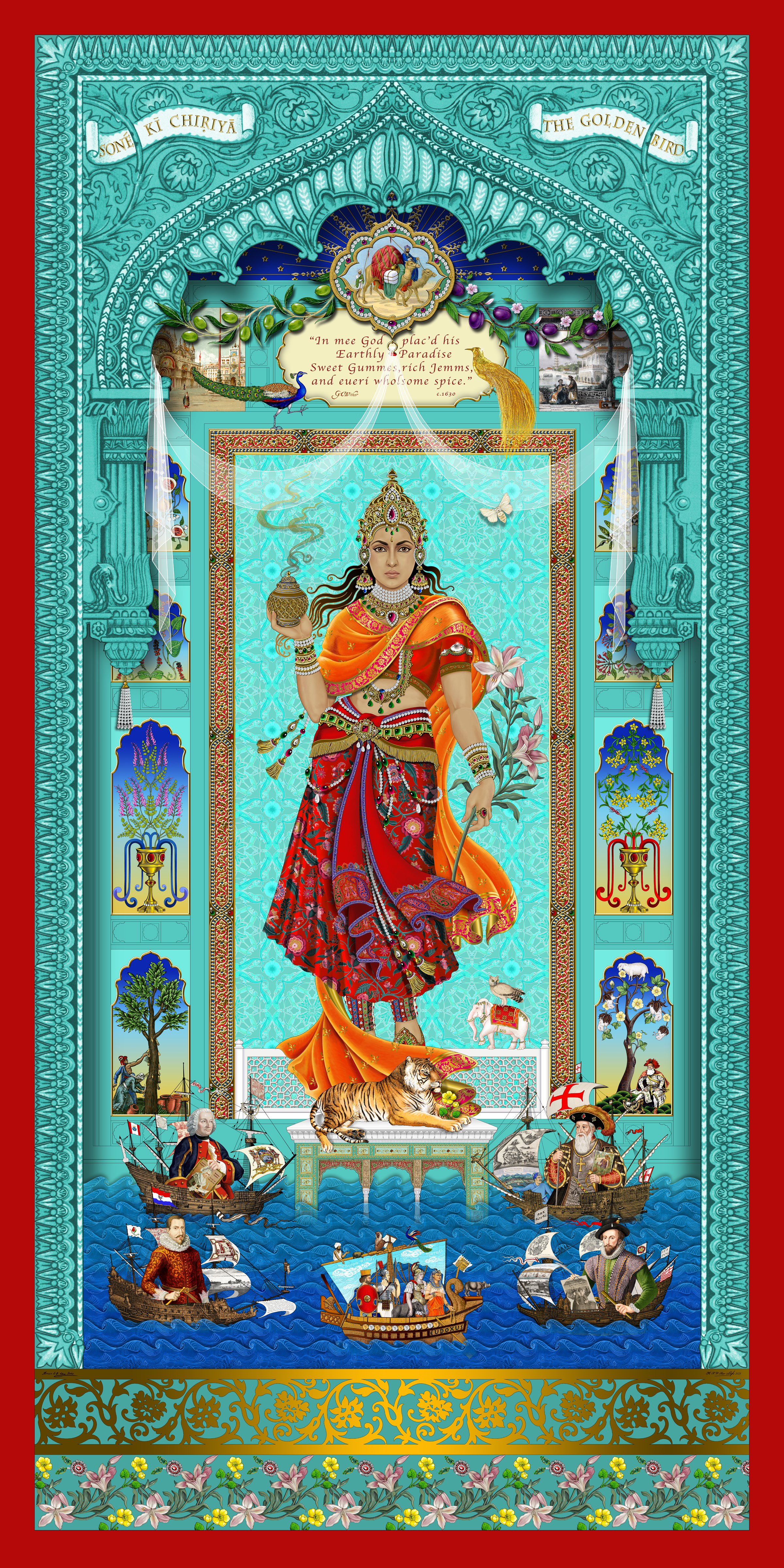 The Golden Bird: Envy of the West “shows an allegorical figure representing pre-colonial India” before the British arrived. It was a “fabled land of untold riches and prosperity”.