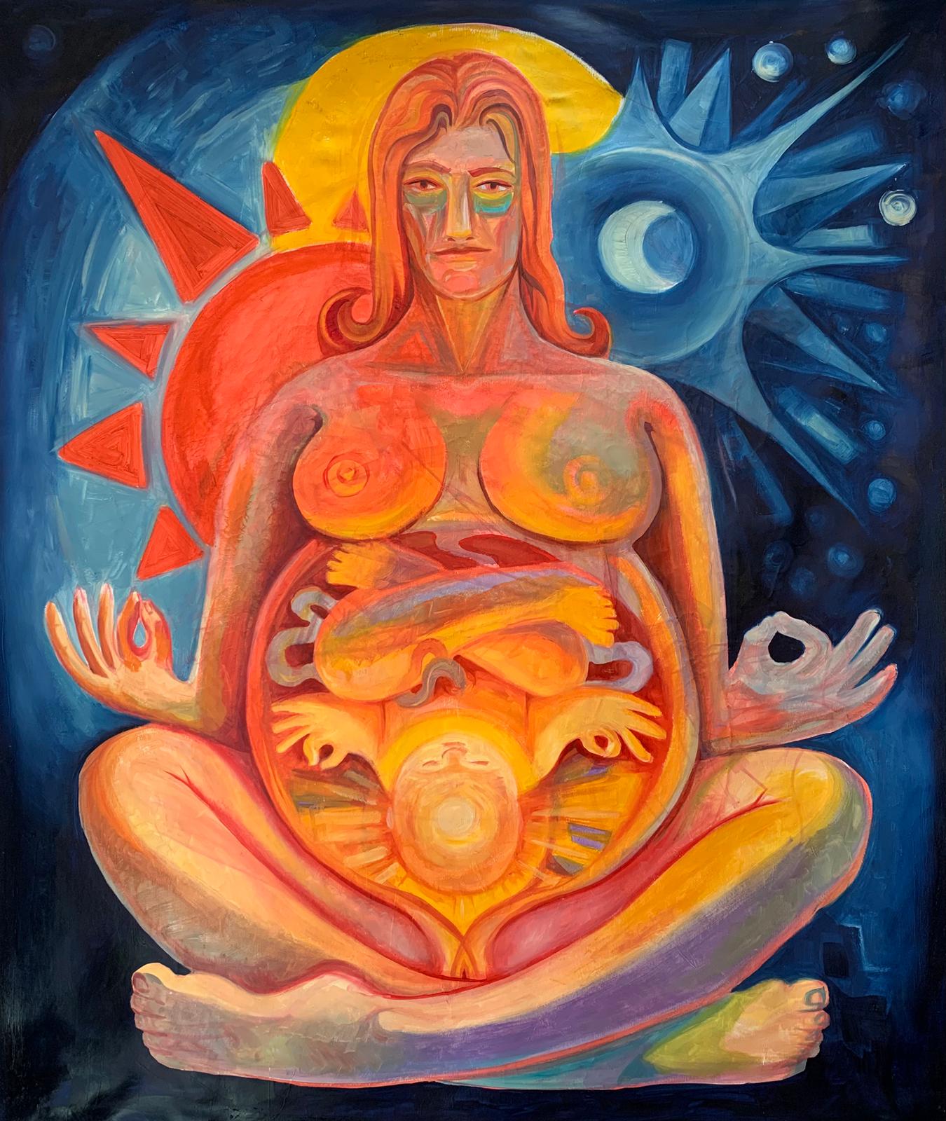 The largest work is Fruits of Labour, a 69in x 48in oil on canvas that he describes as a “tip of the hat” to his grandfather’s famous and visually similar Birth. Fruits of Labour (below) commemorates the birth of Solomon’s mother Keren, the daughter of F.N. Souza and his influential partner and muse Lisolette, a Czech-Jewish actress who fled from Prague to London in 1939.