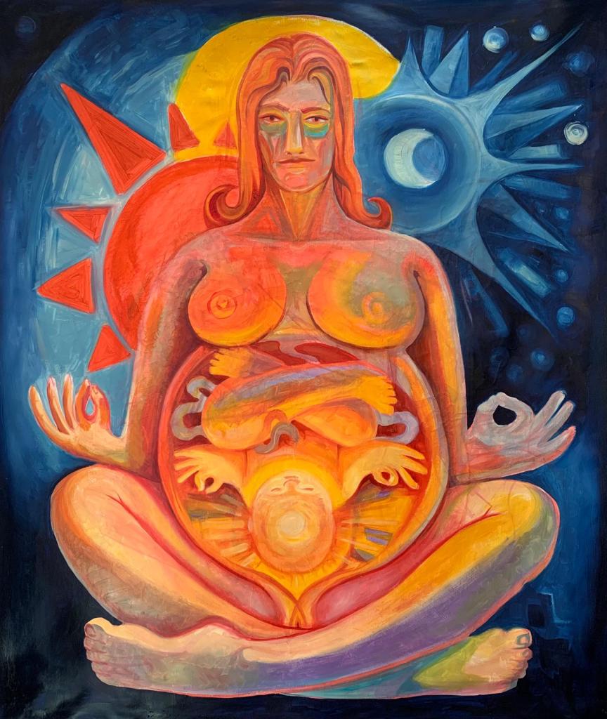 Next to Fruits of Labour is Life (below) that I felt had Buddhist overtones. It celebrates Solomon’s son’s birth and depicts him turning in the womb. Unlike all the other works, it is not, his wife has insisted, for sale.