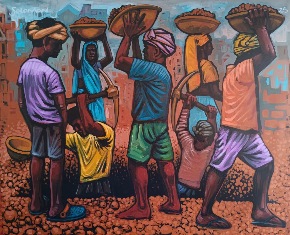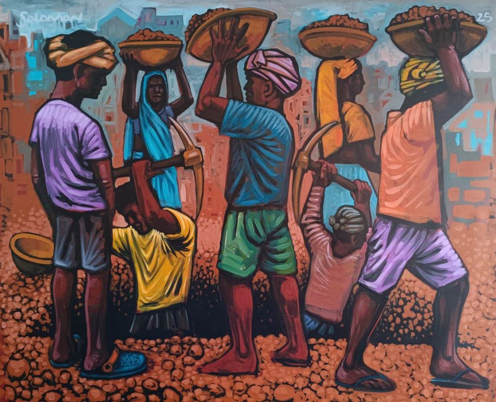 “Solomon’s work has a unique freshness, showcasing a remarkable artistic talent for drawing,” says Pheroza Godrej who owns the gallery. “While portraying the themes of human birth and manual labour can be challenging, he has successfully accomplished this”.