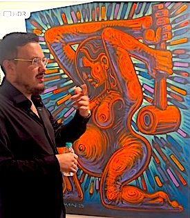 But there’s more to it than that. “Painting should be a burst of energy when you have an idea. It has to be done there and then,” Soloman told me while he was painting – in just three or four hours – a 12ft x 8ft mural (below) that is now hanging outside an exhibition of his work at the Cymroza Gallery in Mumbai.