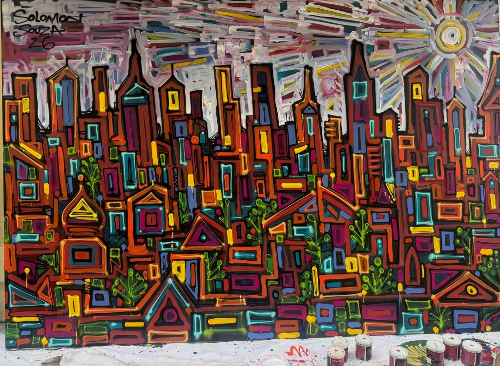 Solomon Souza paints fast. He had to he says when he began doing graffiti around the age of 12. “In the street you have to be fast, or you finish up in jail”. When he moved on to painting more acceptable wall murals, it was expensive hiring cranes, so speed was again important.