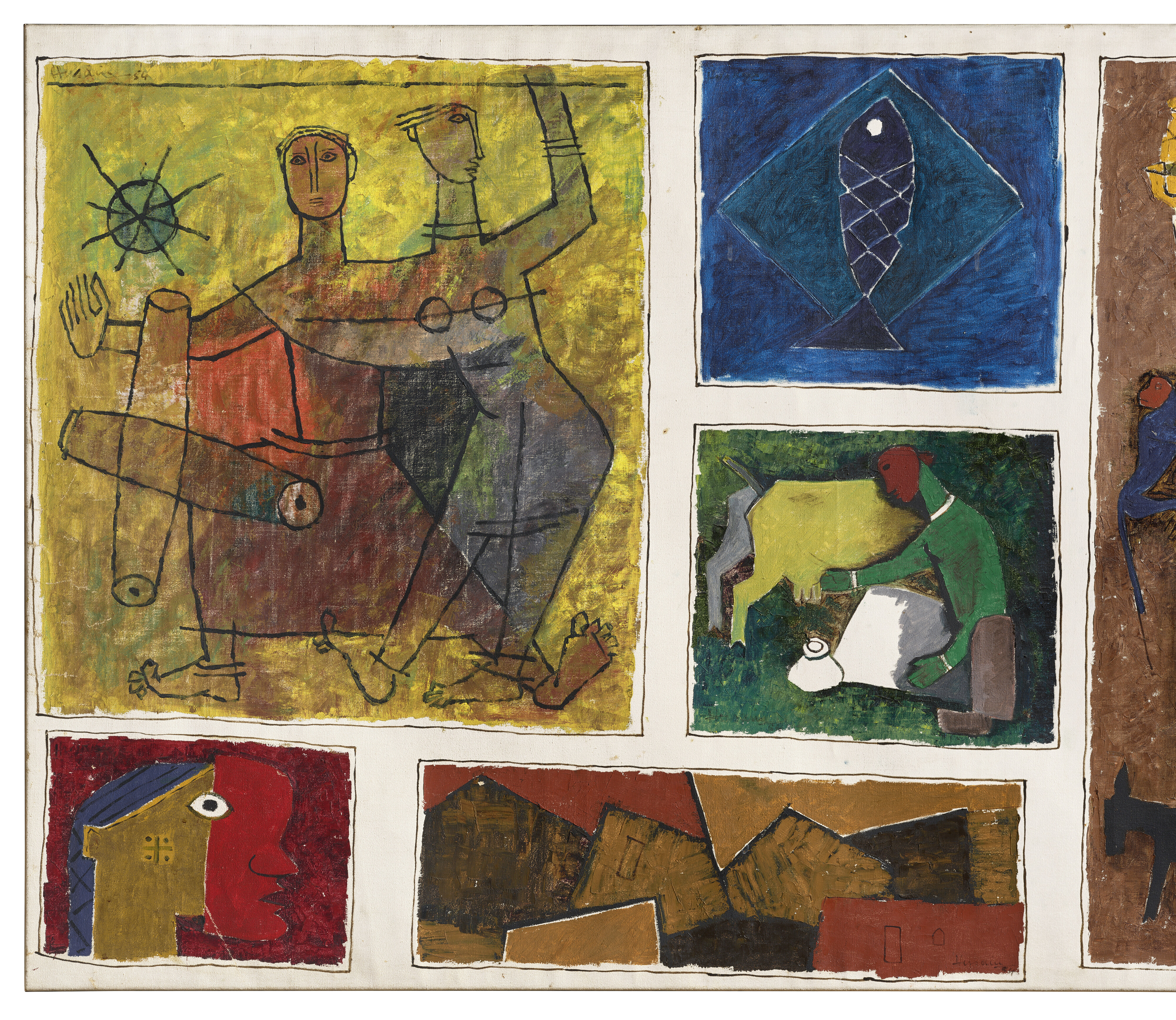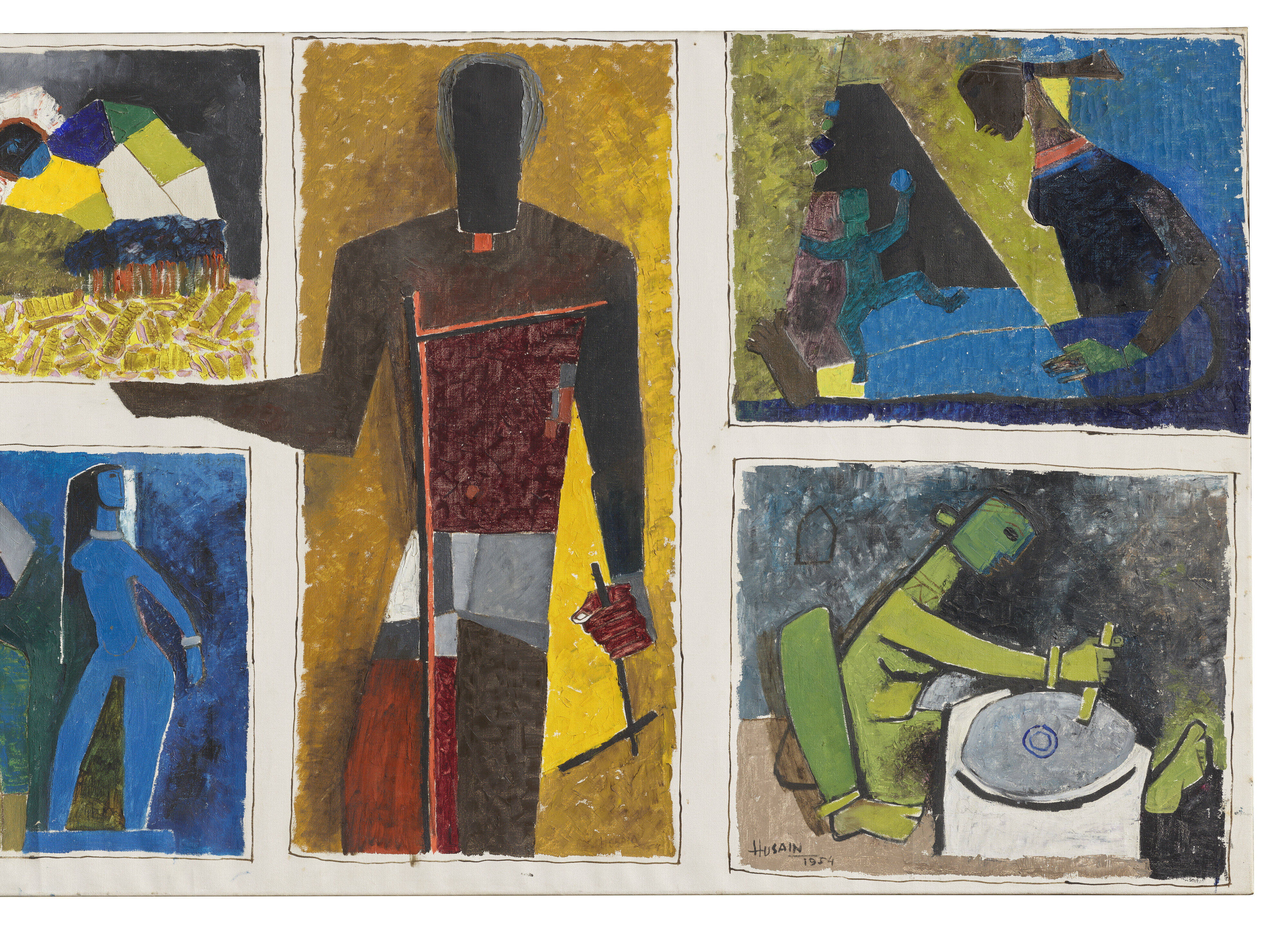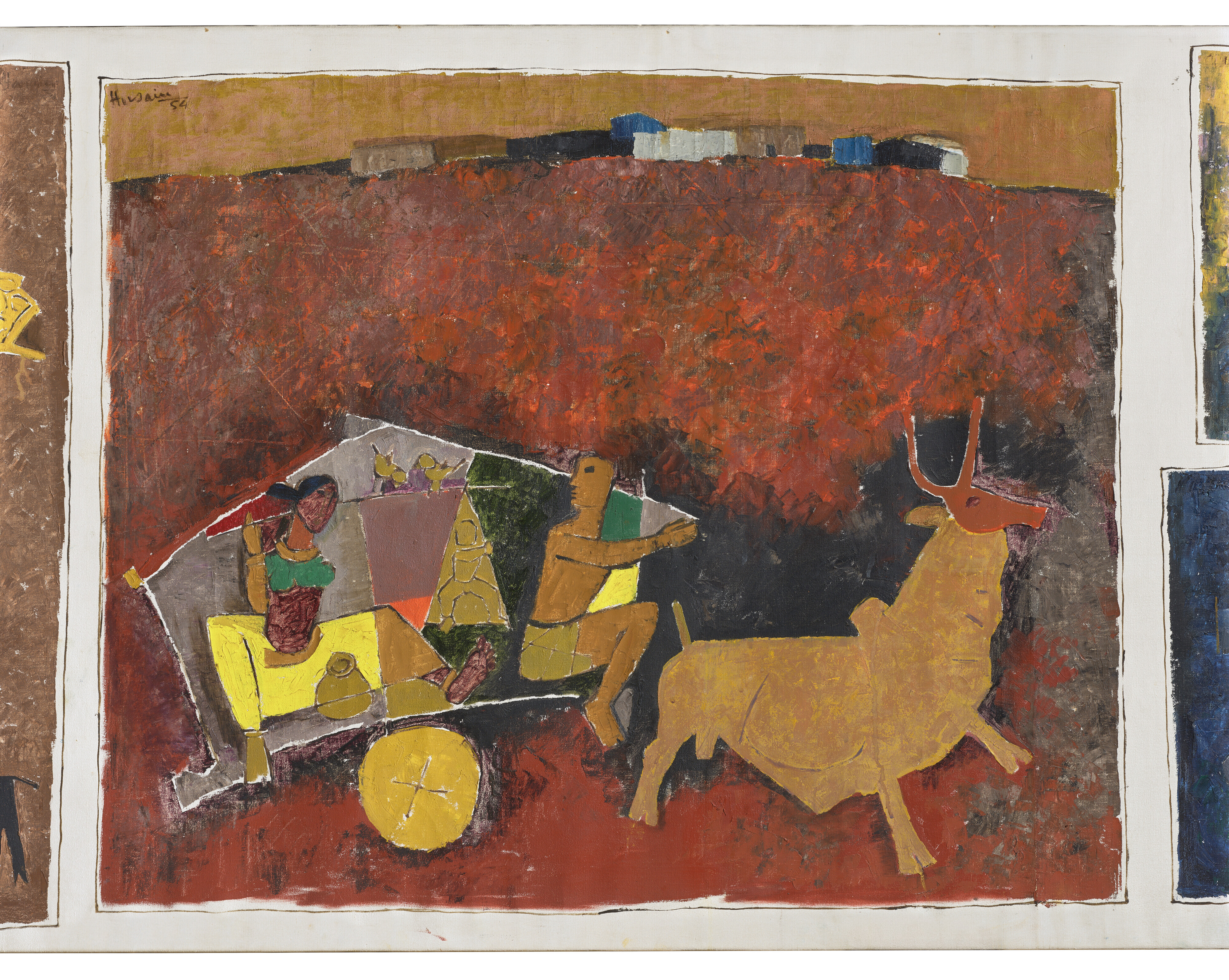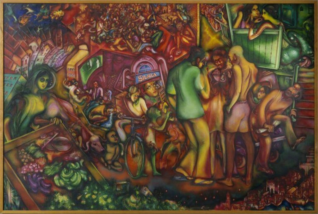 “City for Sale”, painted after riots in his home town of Baroda, G.M.Sheikh wrote: ‘Our rich and valuable experience of diversity of faiths, ideologies, attitudes, has been brutalized by successive bands of mafiosi“. The oil on canvas is in London’s V&A collection.