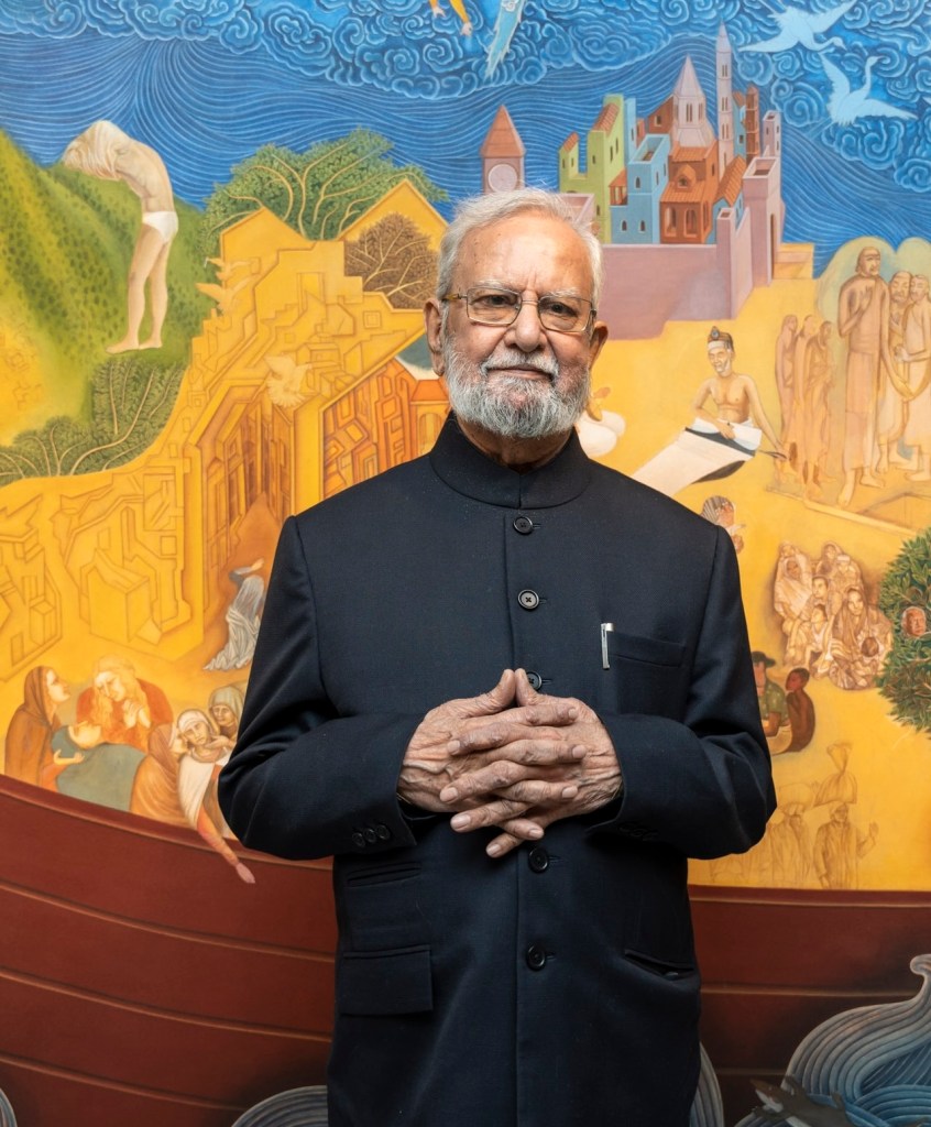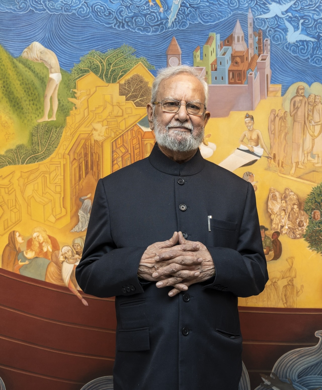 Gulammohammed Sheikh in front of his massive “Kaarawaan” painting (seen in full below)