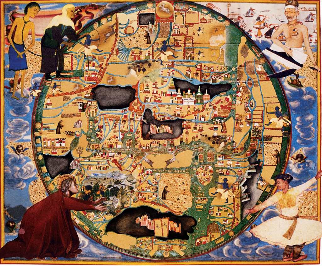 Part of the G,M.Sheikh’s ‘The Mappamundi Suite” (2004) reimagining the 13th century Elstorf map with a digital collage of gouache on inkjet
