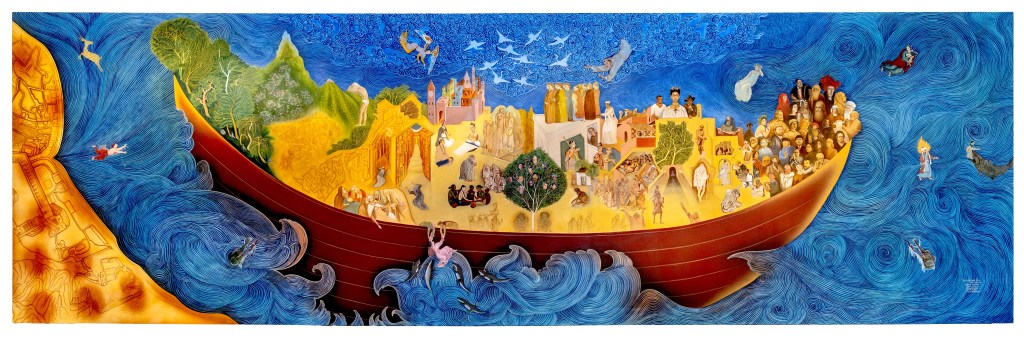 Kaarawaan is his latest major work. It highlights factors in his life with trees, urban areas and famous artists, who he says have been part of his journey, all together in a massive ark. “There is a time in the life of everyone when you think ‘let me take it all with me and move on’,“ he said. He borrowed the idea of the ark-like boat from 18th century folklore ‘A Boat Adrift’, a work by his favourite painter, the famous Indian miniaturist Nainsukh.