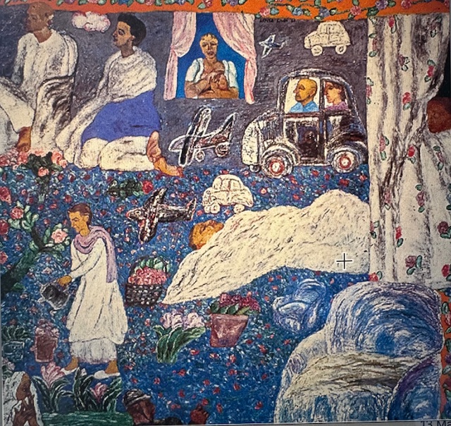 It is tempting to describe Arpita Singh’s large oils as cluttered or as a cacophony, but that would be too negative for her complex rendering of Indian life with a seemingly unstructured array of women and men standing, lying, or sitting among almost map-like landscapes and townscapes that include cars, buildings and (almost always) disconnected aircraft.
