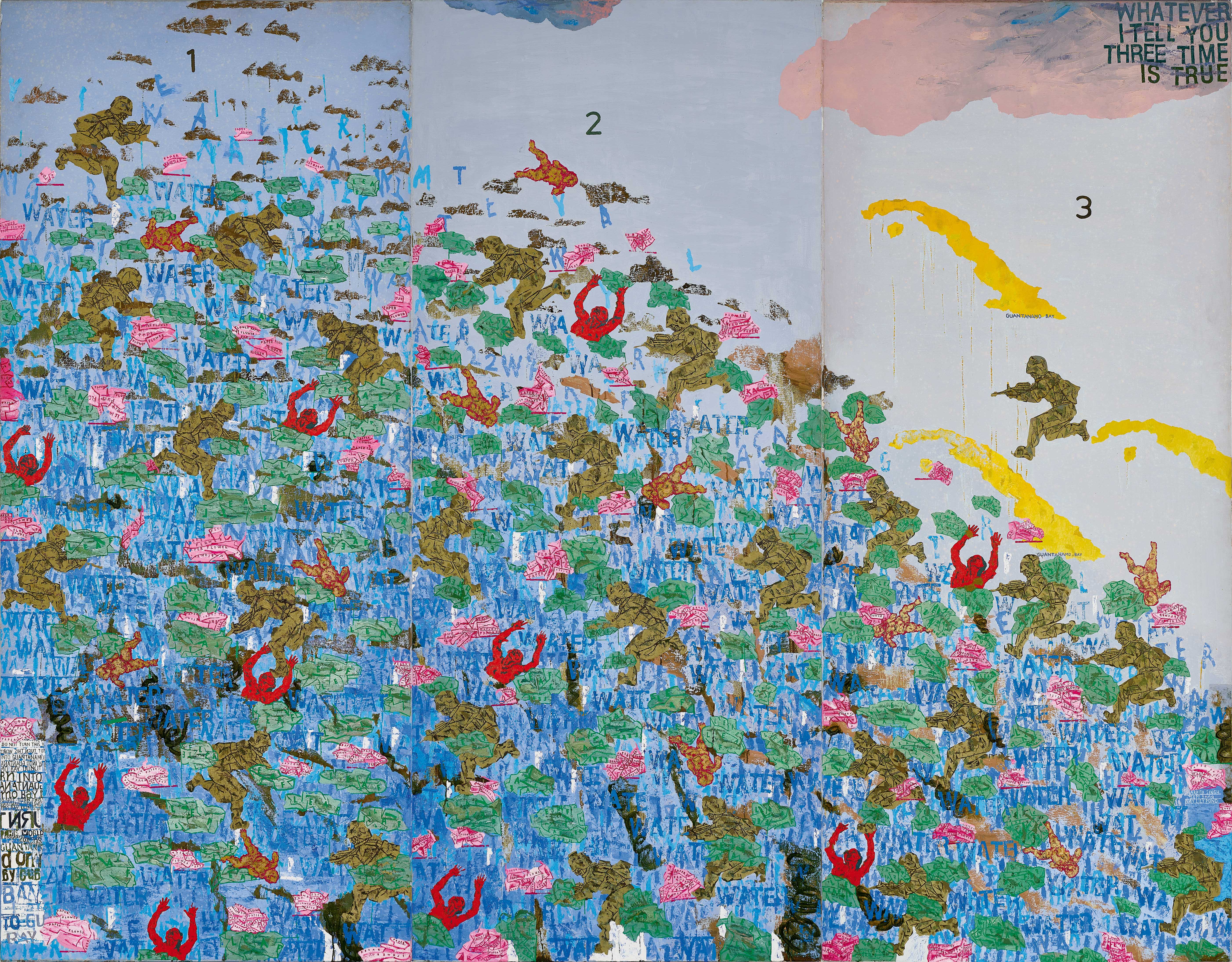 At first glance it looks a calm mix of colours. The word WATER is repeated across the canvas with pinkish water lilies, but the detail – topically – reveals armed soldiers bearing down on drowning men.