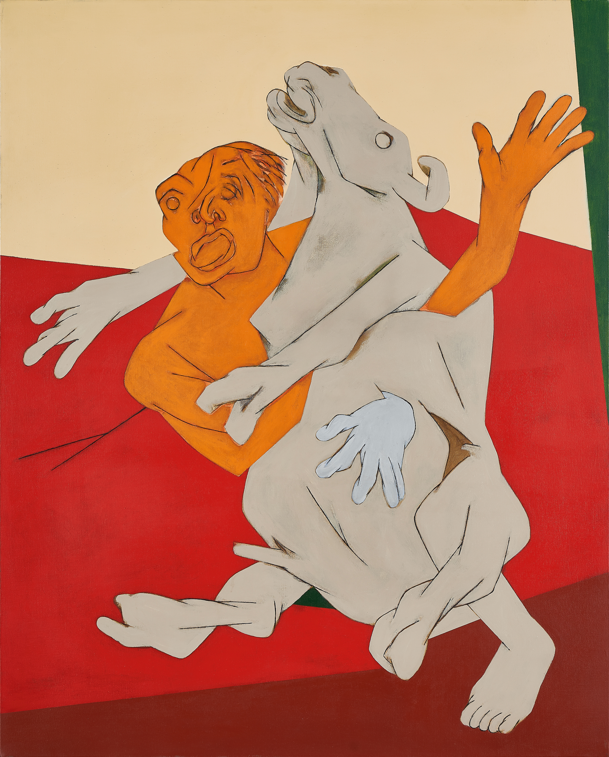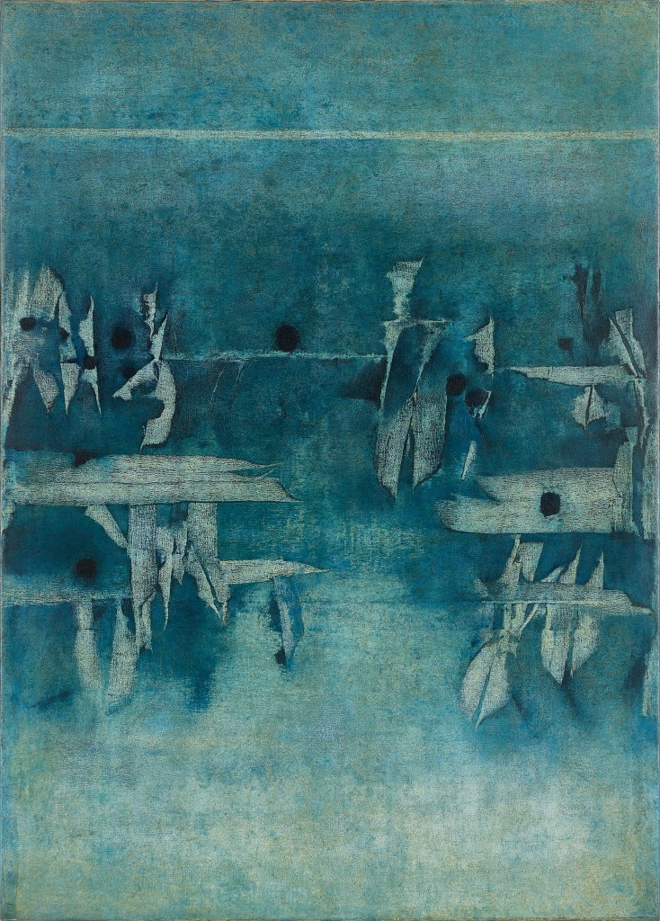 Painted in 1965, it depicts four ghostly figures in long yellow robes about to board two ships, and marked a significant trend in Sabavala’s work,